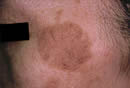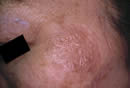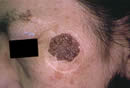1. 左ホホの大きなしみです。 2. 2週間後の来院時は黒くて薄いカサブタになっています。 3. このカサブタをはがすと下からきれいな皮フが再生されています。 はがれたカサブタをはがしたばかりの皮フは薄いですが、しばらくすると周囲の皮フと同じになります。